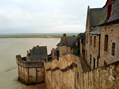 Mont Saint-Michel is an island castle built in a bay located between Britanny and Normandy. The location is superb, the Mont itself and its castle, church, ramparts, etc.are well worth the visit. When they say in the brochures that the tide comes in at the speed of a galloping horse, they're not kidding. In one hour (the time to eat dinner), we went from low tide and sandy beaches to being on an island.