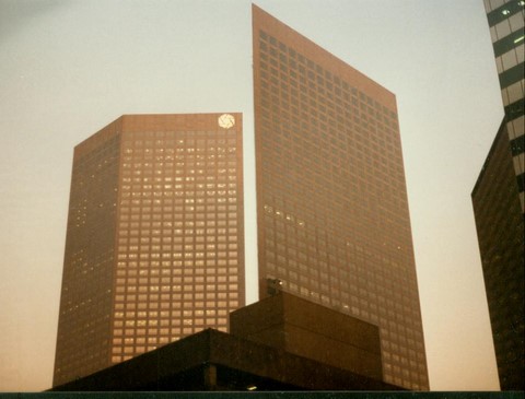 JM used to work there, at Credit Lyonnais on the 35th floor of the Bank of America tower. Just across the street was the Bonaventure Hotel, where many sci-fi conventions were held. (I interviewed Anthony Daniels (C-3PO there.) There is an odd illusion of perspective... The building in the center of the photop looks flat, like a giant credit card standing on its edge...