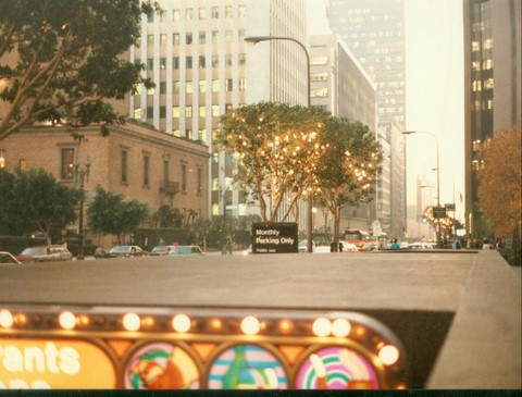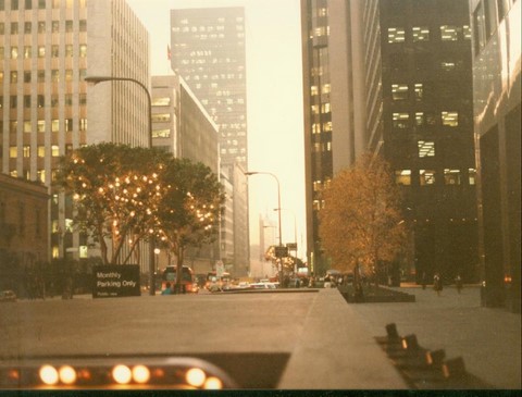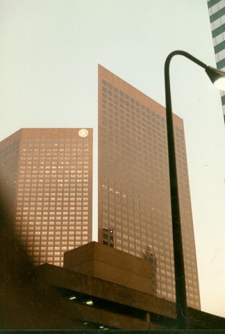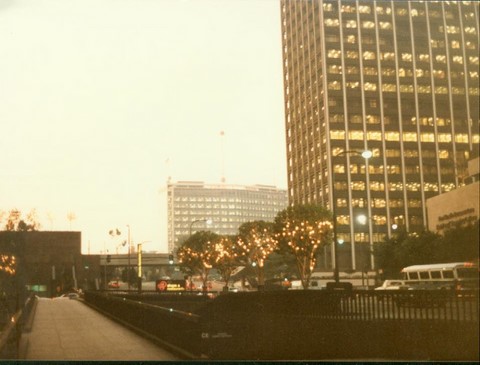 JM used to work there, at Credit Lyonnais on the 35th floor of the Bank of America tower. Just across the street was the Bonaventure Hotel, where many sci-fi conventions were held. (I interviewed Anthony Daniels (C-3PO there.) There is an odd illusion of perspective... The building in the center of the photop looks flat, like a giant credit card standing on its edge...