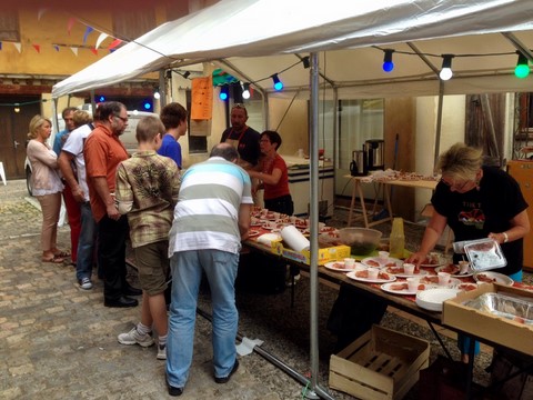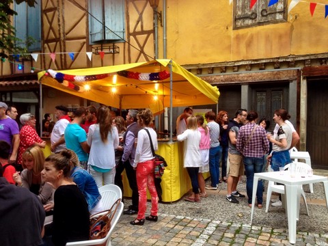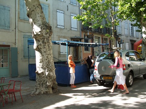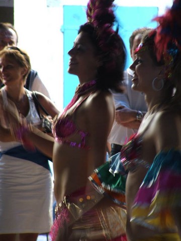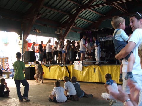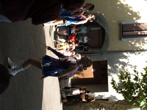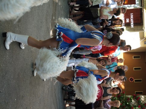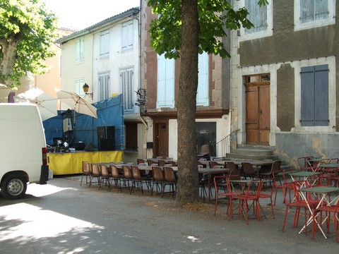 On July 2,2005,  Chalabre held its Street Festival. During the afternoon and the night, street merchants sold food, wine and various local products. There even were a couple of booksellers, including us. (We sold a dozen books.) At 8 p.m., tables had been set up all around the central market square and an excellent communal dinner was served. There was plenty of music everywhere, including a Brazilian-style band and samba dancers. The festivities went on until 4 a.m.