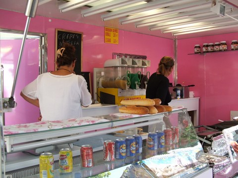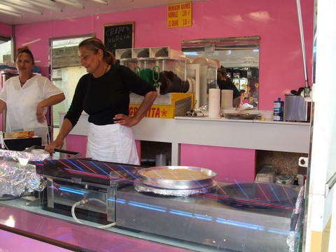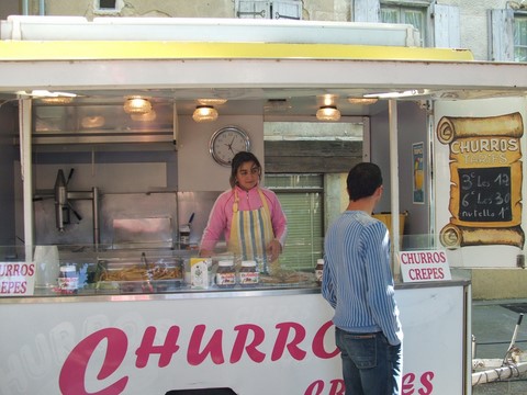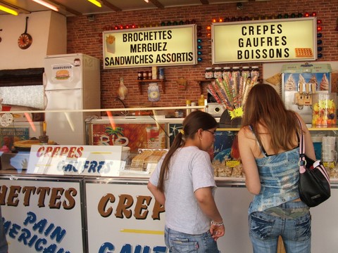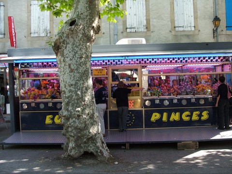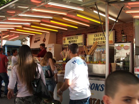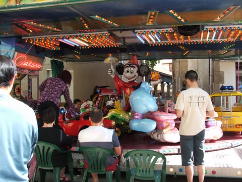 The bar, or buvette, is being set up right by our front entrance (the green door to the left). (Oh, joy!) A miniature go-kart circuit is set up with inflatable barriers for the kids. Neighbor M. Roger sets up his poney rides. Churros, one of the new delicacies currently in fashion. (Just like in L.A.!) The shooting gallery. The lottery booth. Cagnotte means treasure chest or piggy bank. A manege for the children. Grandparents watch their kids on the bumper cars. Win a stuffed animal! If you can grab it, it's yours! Mickey presides over this kids' carousel. A food stand full of yummy fair food.
