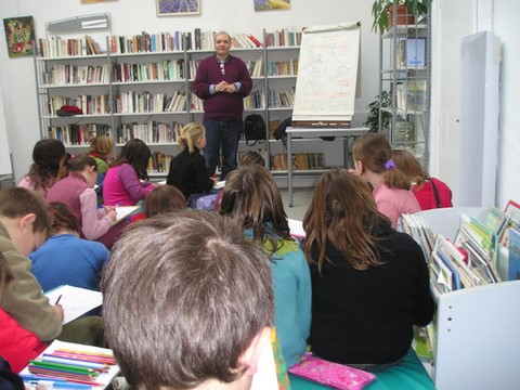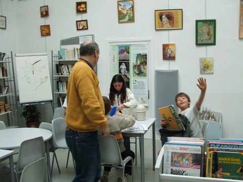 2006. Noelle, the wonderful librarian of Chalabre, and Mme. Pericot, a teacher at the local school, organized an afternoon event at the library during which Jean-Marc helped an eager crowd of 10-year-olds each draw their very own Spider-Man comic page. (Spider-Man © Marvel, of course!). The children chose the theme: Spider-Man is on holidays in Tahiti, goes diving and finds a treasure!