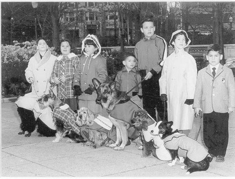 Thus, one fine Philadelphia morning, the seven of us were awakened by our parents and bundled off to Rittenhouse Square. There, we were dressed in cute little coats and introduced to our hearts’ desire: six dogs of differing breeds, each dressed to match a child, or in one case, a pair of children.